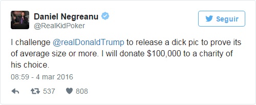 როგორც ჩანს, კანადელი მოთამაშე დანებებას არ აპირებს! დაახლოებით ერთი კვირის წინ დენიელ ნეგრანუმ განცხადება გააკეთა იმის შესახებ, რომ დონალდ ტრამპს, ამერიკის საპრეზიდენტო არჩევნებში, გამარჯვების არანაირი შანსი არ ჰქონდა. 'პოკერსტარსის' სახე თავისი სიტყვების დასადასტურებლად დიდი ბეთის გაკეთებასაც გეგმავდა. უნდა აღინიშნოს, რომ ნეგრანუმ უკვე მიიღო ამერიკის მოქალაქეობა, რაც იმას ნიშნავს, რომ მას არჩევნებში მონაწილეობის უფლება აქვს - შესაბამისად, როგორც ამომრჩეველს, საკუთარი ინტერესების დაცვა სურს და რესპუბლიკელების მხრიდან სწორი კანდიდატის წარდგენას ითხოვს.